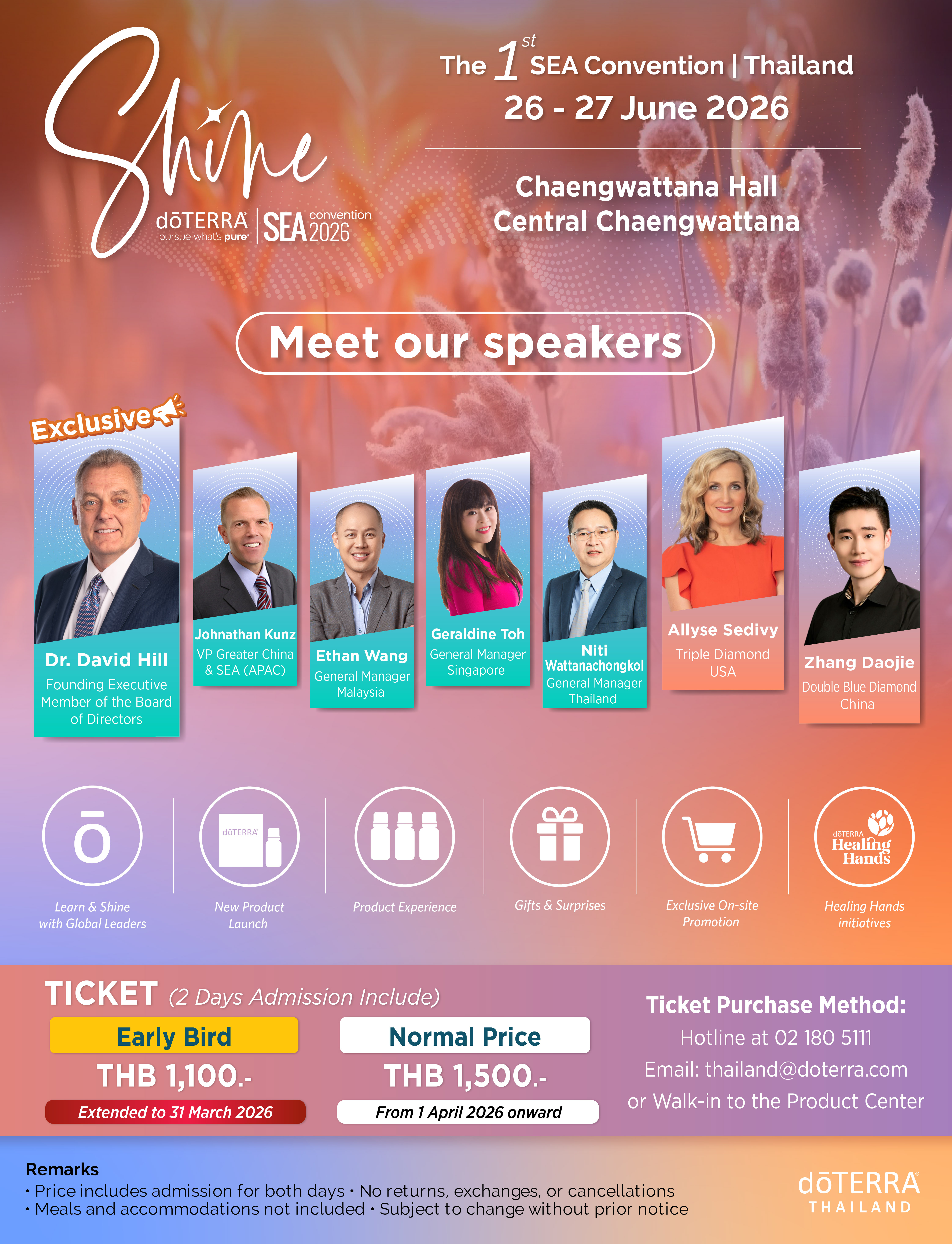 At SEA Shine Convention 2026, attendees will experience an exciting and inspiring program designed to energize and empower our community. It is a unique opportunity to connect, exchange ideas, and learn from one another, while gaining inspiration from leaders and strengthening the growing doTERRA community across Southeast Asia.