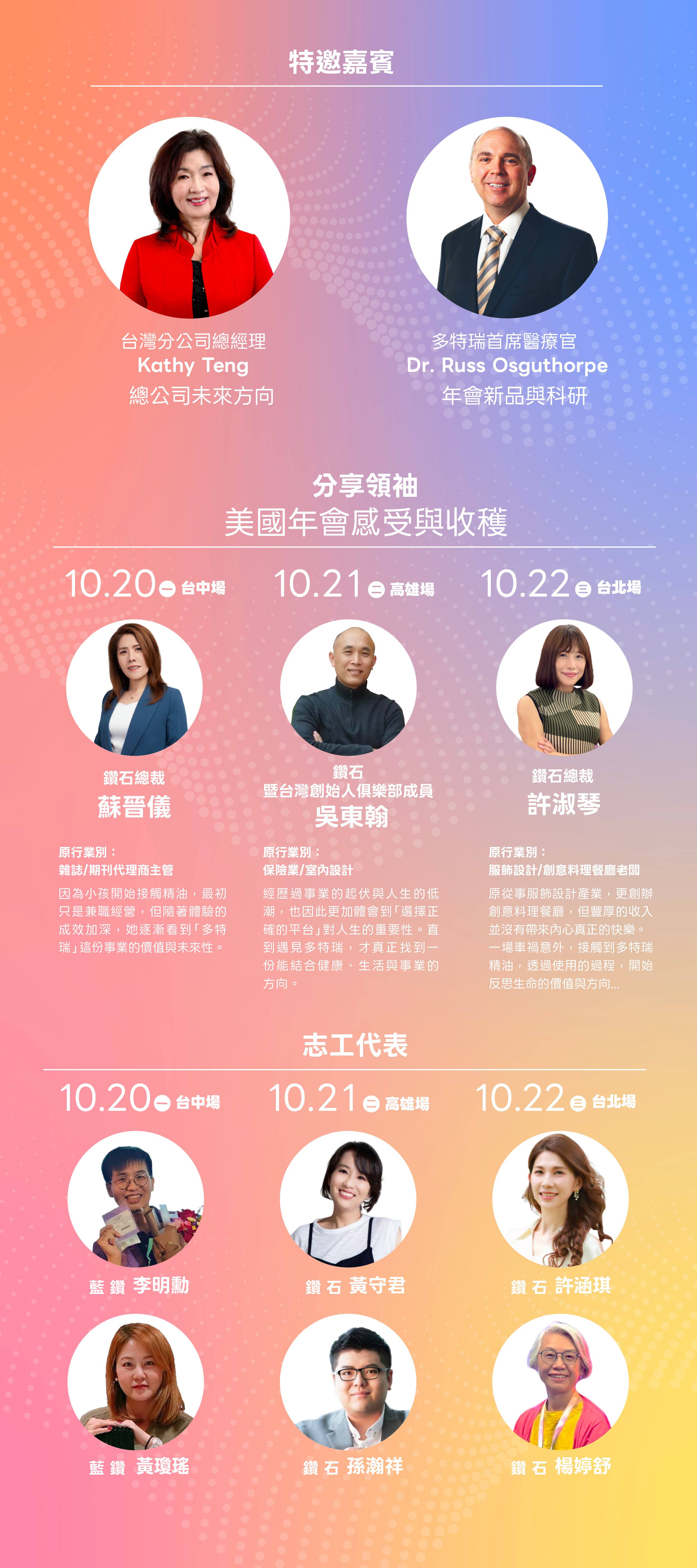 2025 多特瑞全球年會會後會將為您帶來總公司最新資訊,讓您掌握多特瑞最新動向及全球策略,同時特別邀請到多特瑞首席醫療官 Dr.O 蒞臨台灣,搶先讓台灣夥伴們了解科研成果,並分享精油知識與實用見解,並可以在第一時間學習到台灣即將上市之新品:VMG+™ 綜合維生素蔬果粉以及EO Mega®+ 複合能量魚油軟膠囊的產品知識。參加者亦可優先購買專屬套組。誠摯邀請您參加這場盛會,搶先獲得體驗新品良機。