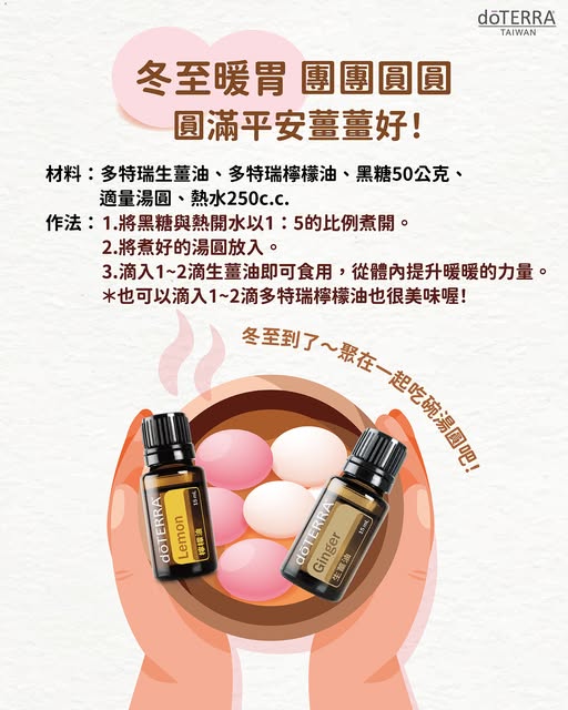 - 關火後,滴入 1~2 滴dōTERRA生薑油即可享用,從體內提升暖暖的力量。