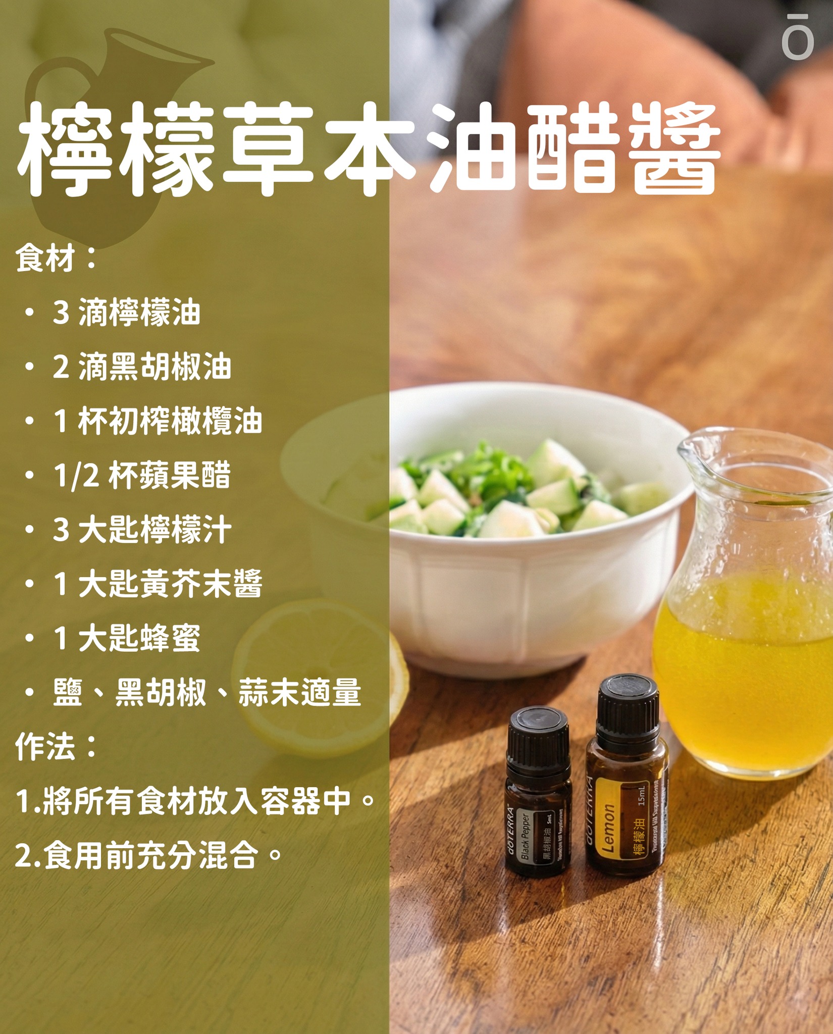 快來試試清爽又開胃的檸檬草本油醋醬,打開冰箱用家裡常見的食材,加上幾滴檸檬油與黑胡椒油,就能讓風味整個亮起來,清新又開胃!