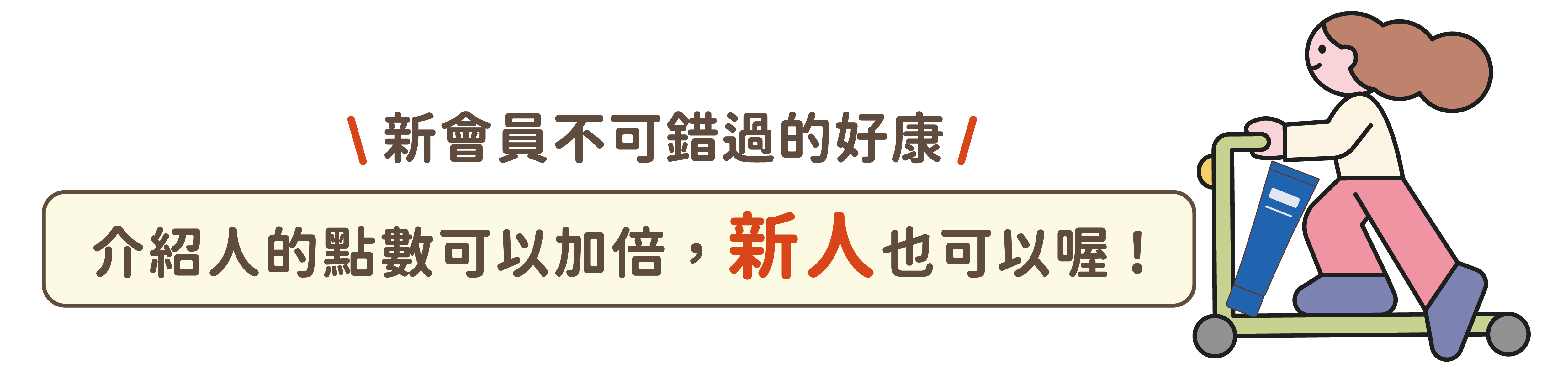 - 新人首購單筆訂單滿 125PV(含)以上並成功付款,可獲得 50 點產品點數,兌換自己喜愛的商品。