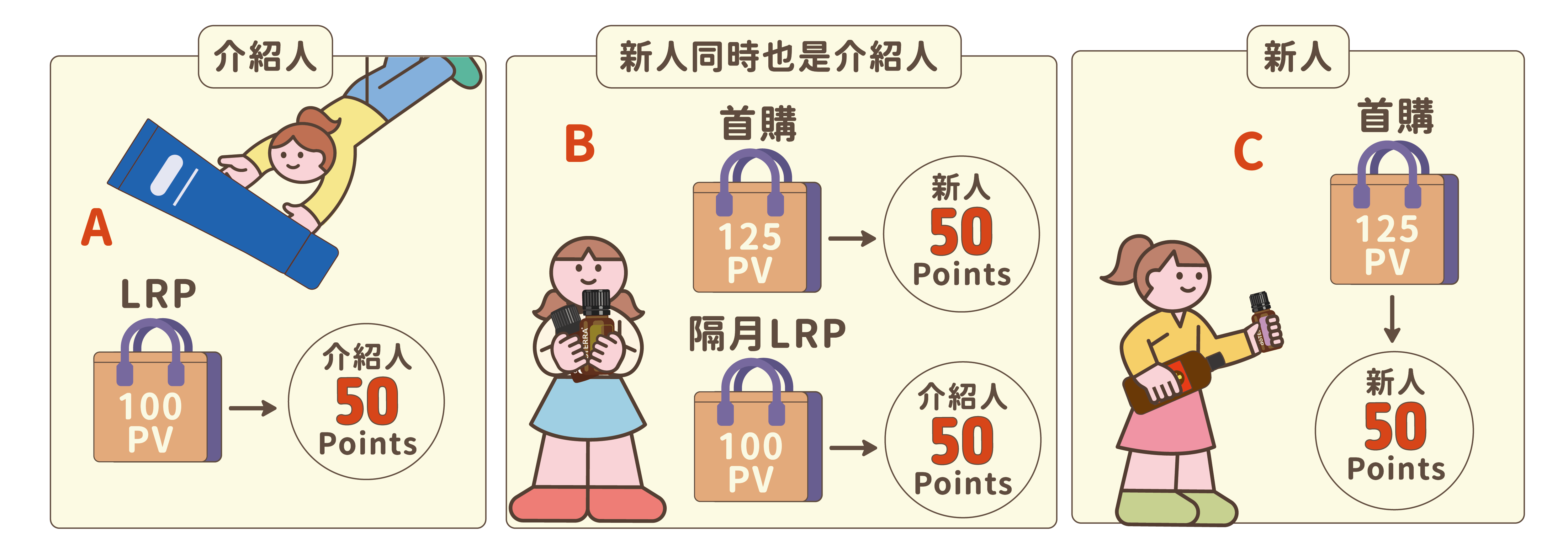 - 新人 B 於 11 月份入會當月、同時也介紹新人 C 入會,新人 B 並於 12 月份完成單筆 LRP 100PV 台灣市場訂單,則新人 B 可於 2026 年 1 月獲得擔任介紹人的 50 點產品點數。《請參考以下圖示》