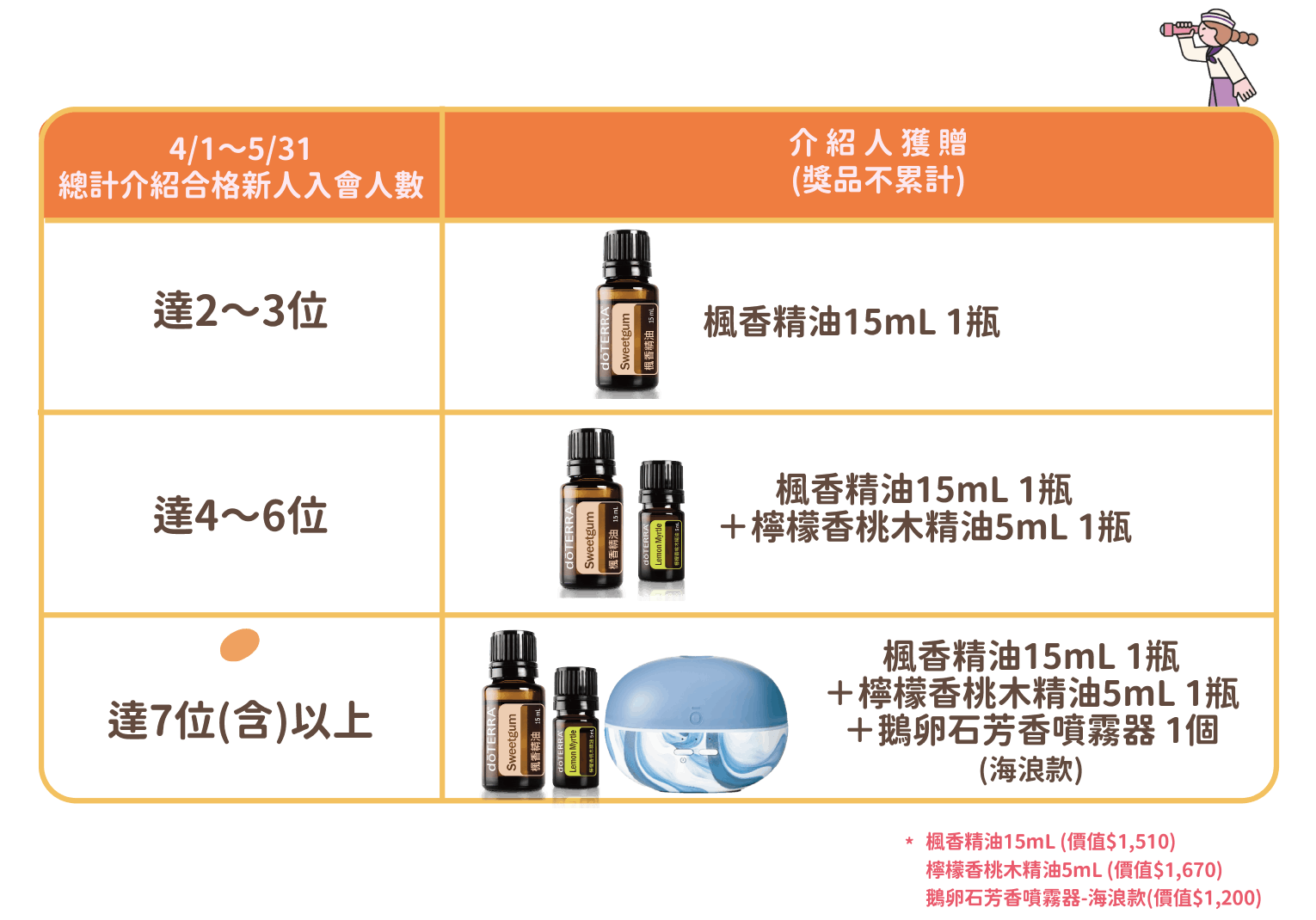 - 達4~6位,可獲得楓香 15mL x 1 + 檸檬香桃木精油 5mL x 1